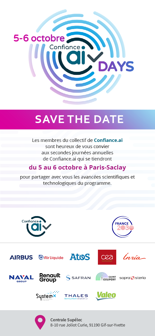 Les membres du collectif de Confiance.ai sont heureux de vous convier aux secondes journées annuelles de Confiance.ai qui se tiendront du 5 au 6 octobre à Paris-Saclay pour partager avec vous les avancées scientifiques et technologiques du programme.